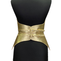 The corset is accessorised with gold buckles, that go perfectly with the textured gold leather chosen for this belt. This corset is suitable for a B and C cup size, and can be worn with and without other clothes underneath.