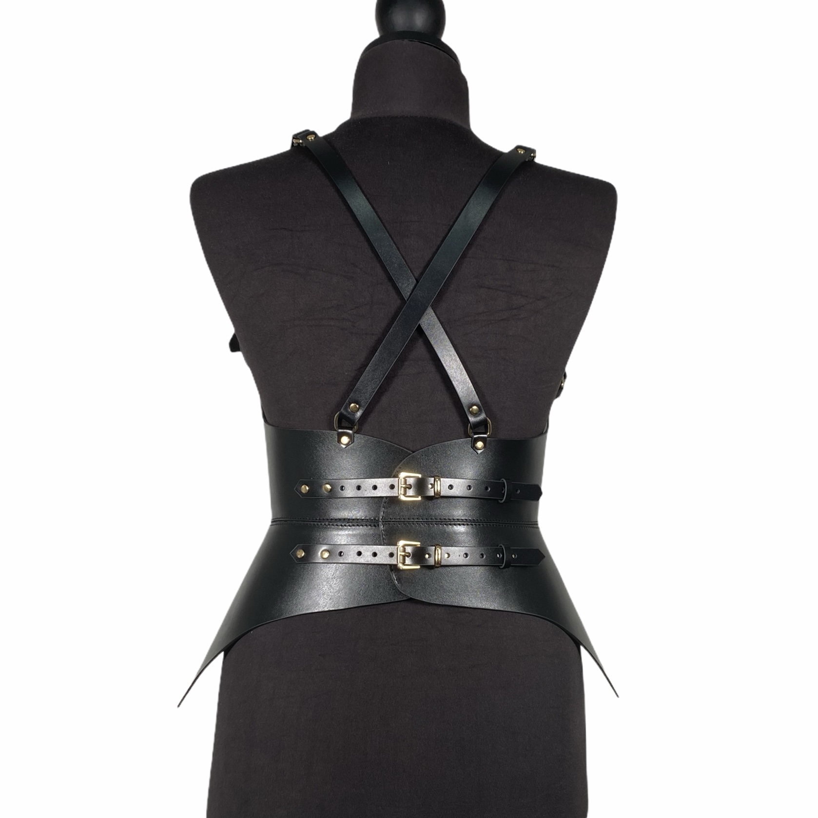 The corset is accessorised with gold buckles, that go perfectly with the black leather chosen for this belt.