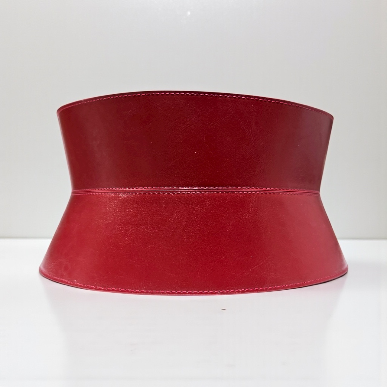 This is a stylish leather corset belt with a red textured finish, accessorised with two gold buckles.