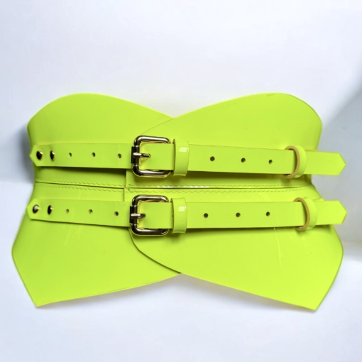 The corset is accessorised with gold buckles, that go perfectly with the smooth old gold leather chosen for this belt.